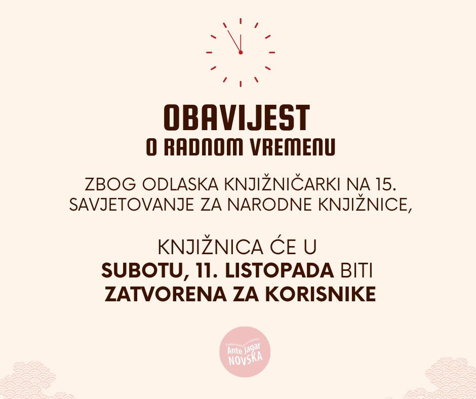 Poštovani korisnici, zbog zdravstvenih tegoba autora ODGAĐAMO promociju knjige “Novskoj s ljubavlju” Đure Vidmarovića. O novom terminu bit ćete pravovremeno obaviješteni. Gradska knjižnica i čitaonica