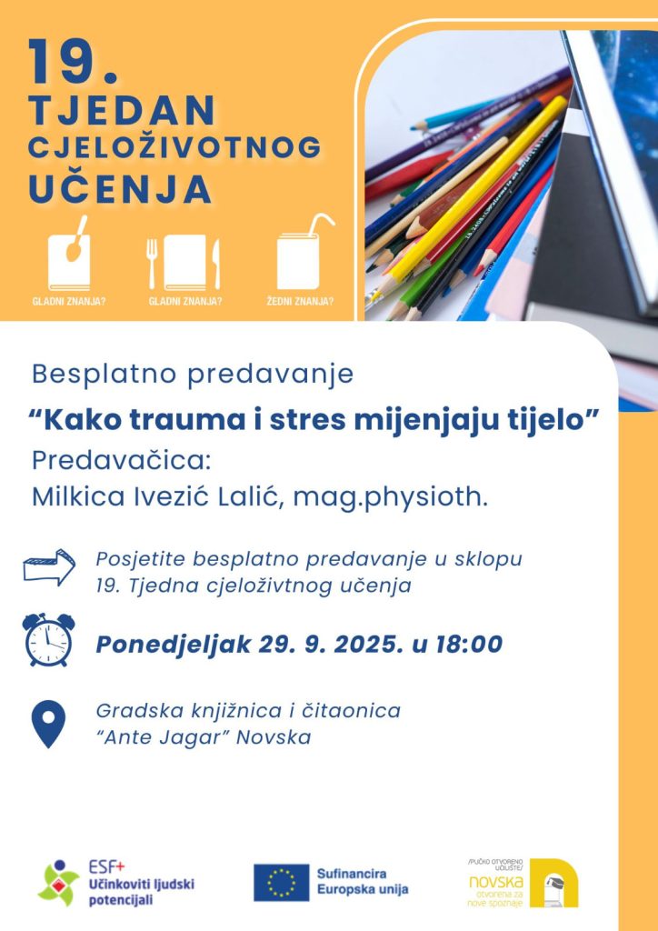 U ponedjeljak, 29. rujna 2025. u 18:00 sati “Kako trauma i stres mijenjaju tijelo” – predavačica Milikica Ivezić Lalić, mag. physioth.